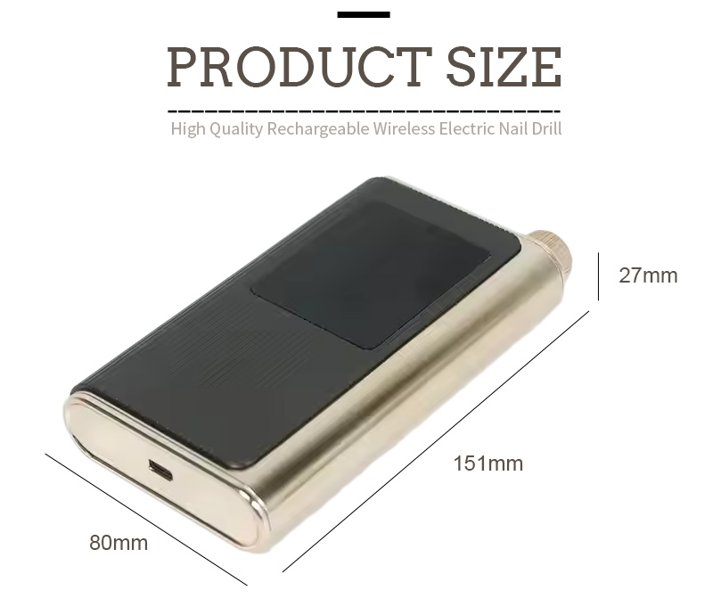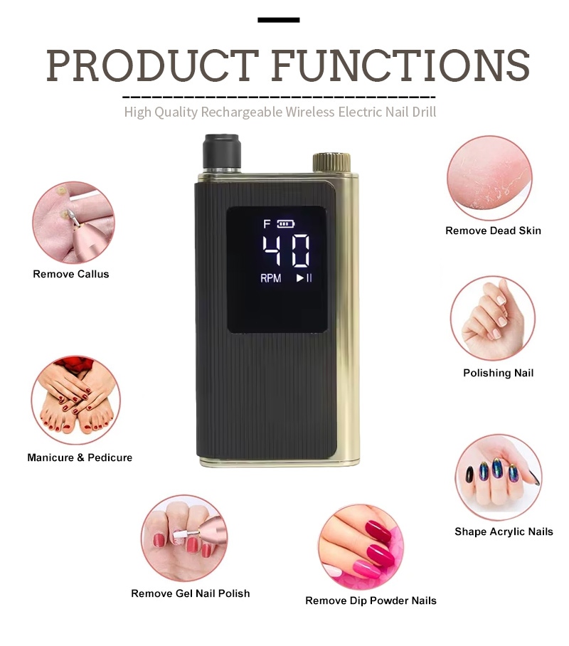 Дизајн дисплеја ове брзе професионалне бушилице за нокте од 40.000 обртаја у минути има прекидач за укључивање/искључивање и ротацију напред/назад за укупно активирање једним дугметом, утичницу за брзо пуњење на дну, заменљиву утичницу за бушилицу на врху и подесиву брзину у три положаја како би се задовољиле различите потребе.