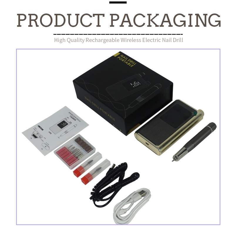 Садржај овог пакета за професионалну бушилицу за нокте велике брзине од 40.000 обртаја у минути садржи производ за брушење, УСБ кабл за пуњење, упутство за употребу производа и лагану и преносиву кутију.