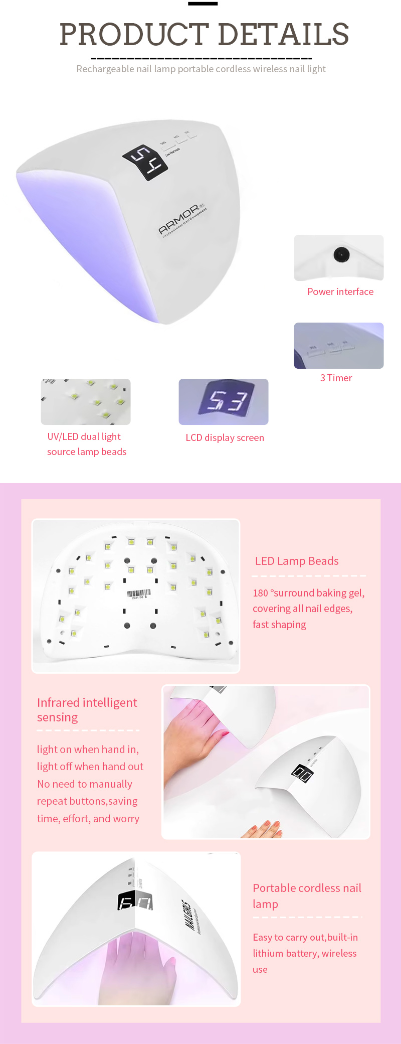 Производ осигурава да је исекну и засељивање без скупљања. Његови двоструки извори светлости пружају нежно гријање да би се спречило ручно уклањање боје и напрезања очију, погодан за обе руке и ноге, испоручујући изузетно брзе резултате сушења.