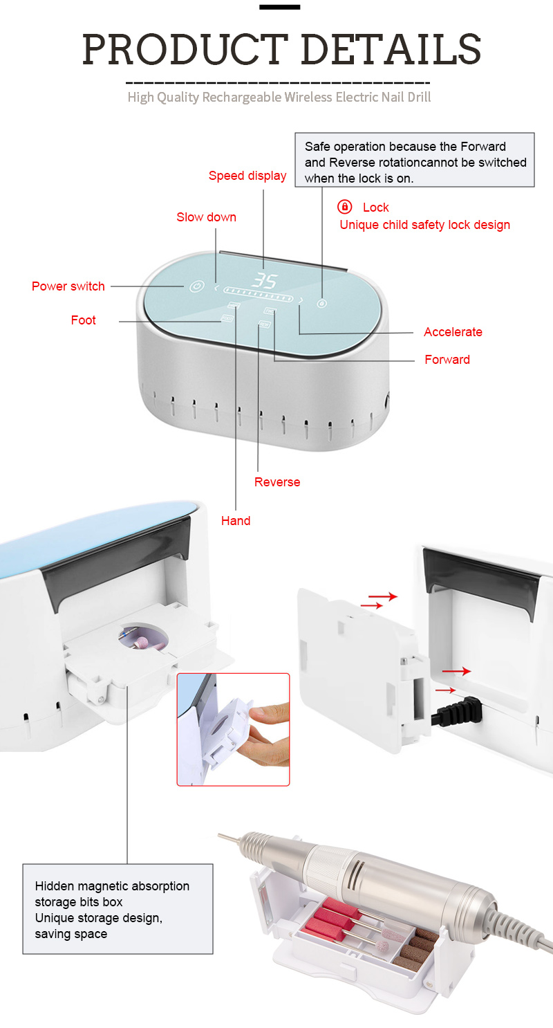 Комплет пуњивих бушилица за нокте Бушилица за нокте на прстима прстију 35в 35000рпм