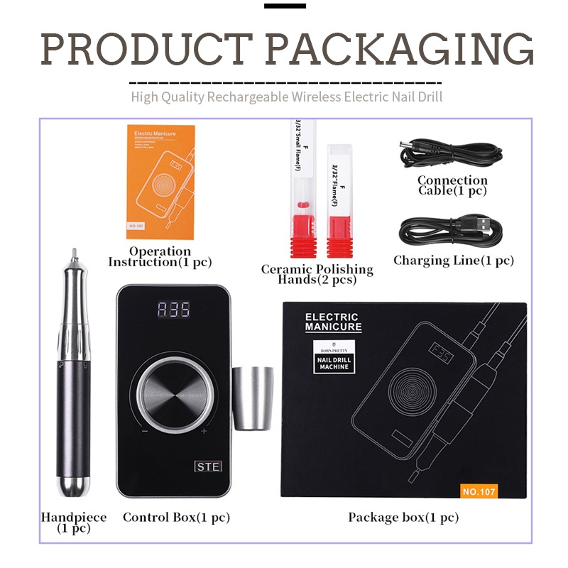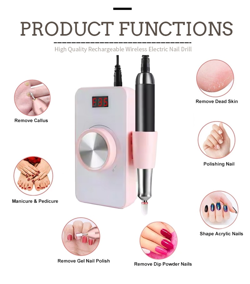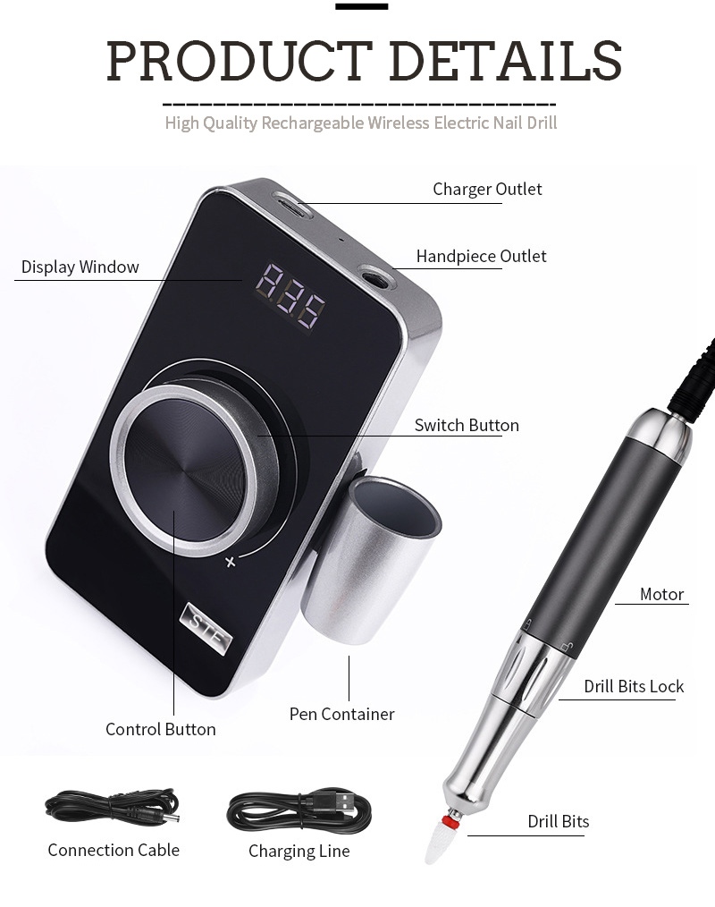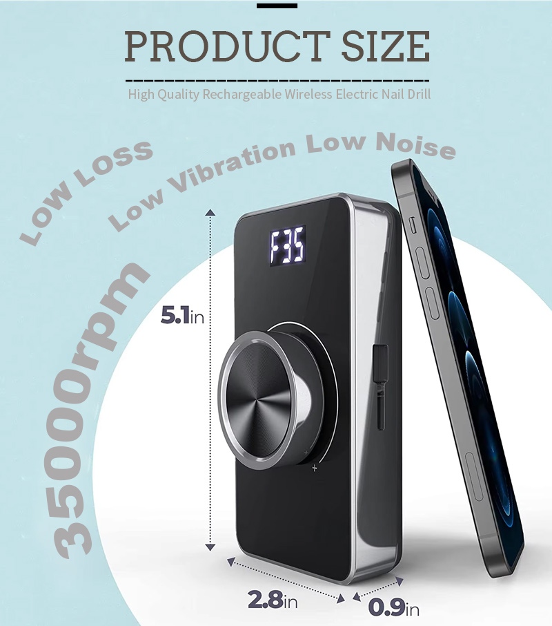 Дизајн дисплеја ове електричне бушилице за нокте од 35.000 обртаја у минути има прекидач за укључивање/искључивање и ротацију напред/назад за укупно активирање једним дугметом, утичницу за брзо пуњење на дну, заменљиву утичницу за бушилицу на врху и подесиву брзину у три положаја како би се задовољиле различите потребе.
