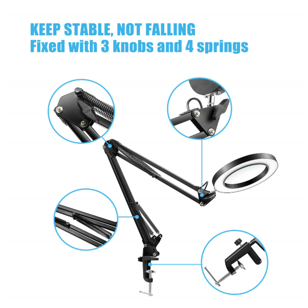 Ова склопива столна лампа која се окреће за 360 степени има елегантан и префињен дизајн. Његово нежно светло је лако за очи, симулирајући меко, природно светло зоре за удобно осветљење без одсјаја. Погодно за више апликација укључујући тетовирање, вез и наил арт.