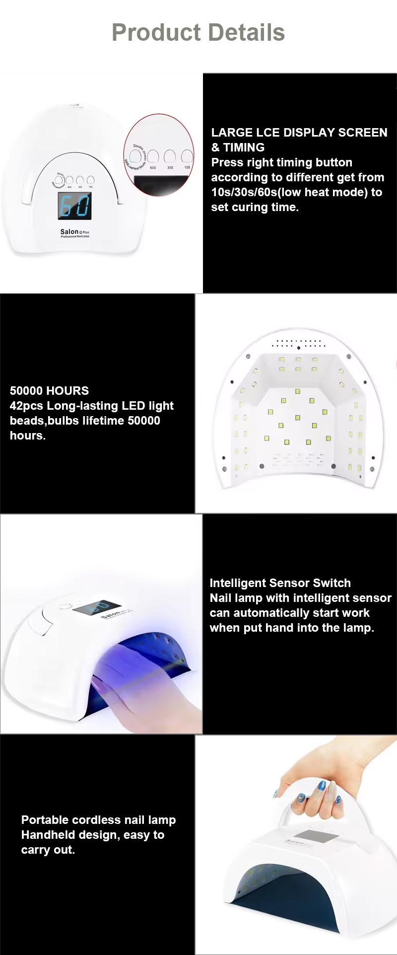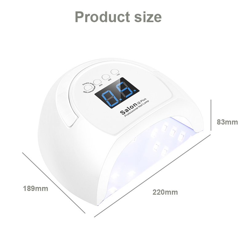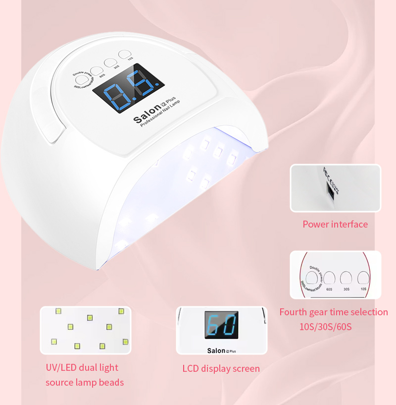 Производ обезбеђује равномерно сушење лепка без скупљања. Његови двоструки извори светлости обезбеђују нежно загревање како би спречили промену боје руку и напрезање очију, погодно за руке и стопала, дајући изузетно брзе резултате сушења.