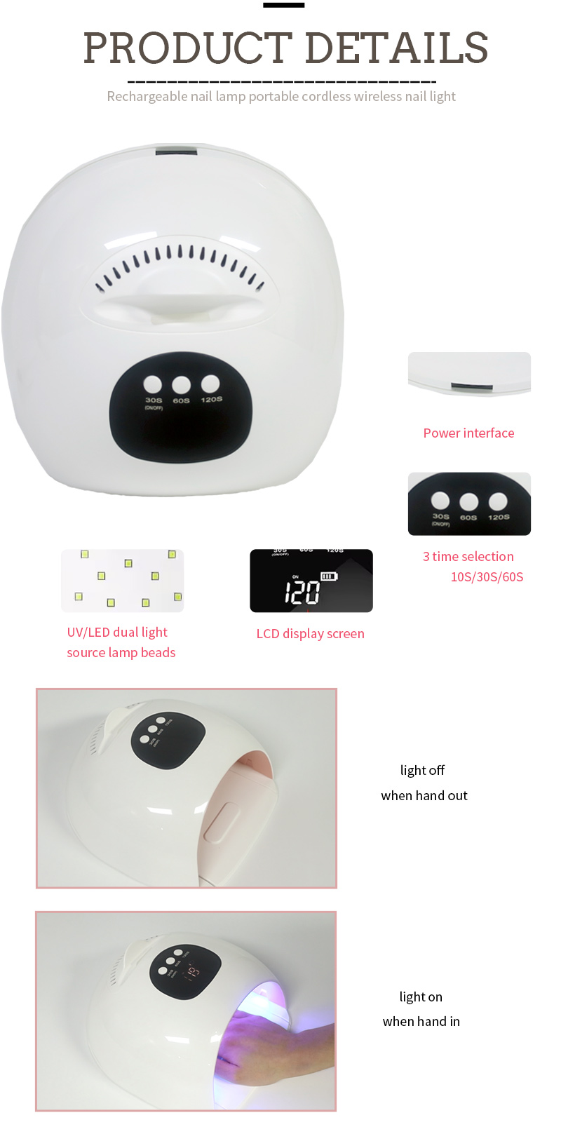 Производ обезбеђује равномерно сушење лепка без скупљања. Његови двоструки извори светлости обезбеђују нежно загревање како би спречили промену боје руку и напрезање очију, погодно за руке и стопала, дајући изузетно брзе резултате сушења.