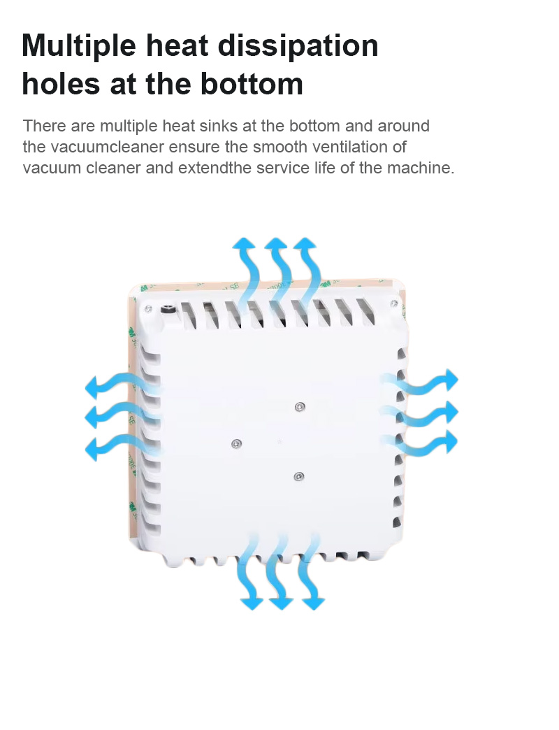 Доњи део производа има рупе за хлађење за глатку вентилацију, а усисивач је дизајниран са више отвора за хлађење на дну и свуда около како би се обезбедила глатка вентилација и продужио век трајања машине.