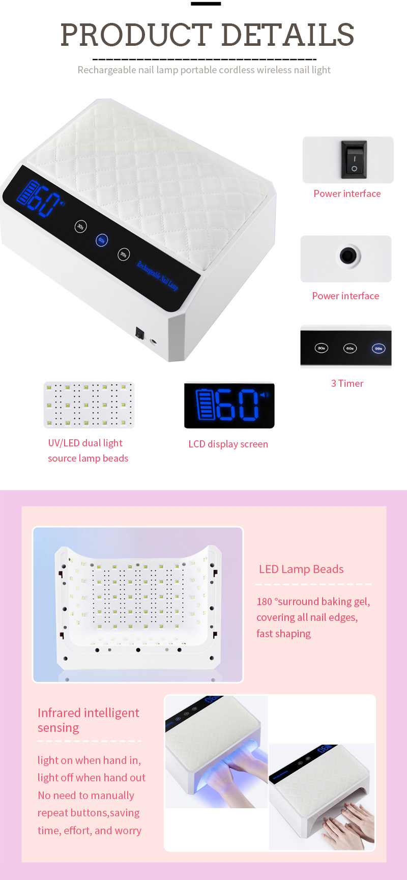 Производ осигурава да је исекну и засељивање без скупљања. Његови двоструки извори светлости пружају нежно гријање да би се спречило ручно уклањање боје и напрезања очију, погодан за обе руке и ноге, испоручујући изузетно брзе резултате сушења.