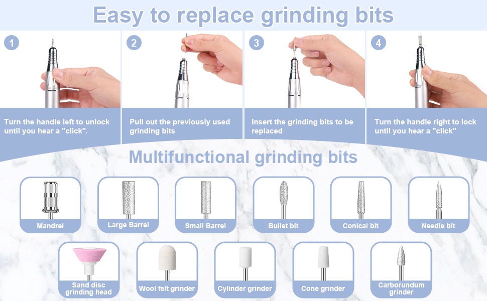 Овај нискошумни преносни комплет бушилице за нокте заменски метод рада бушилице, то јест, укључите и извуците, лак и згодан, замена се може користити након завршетка.
