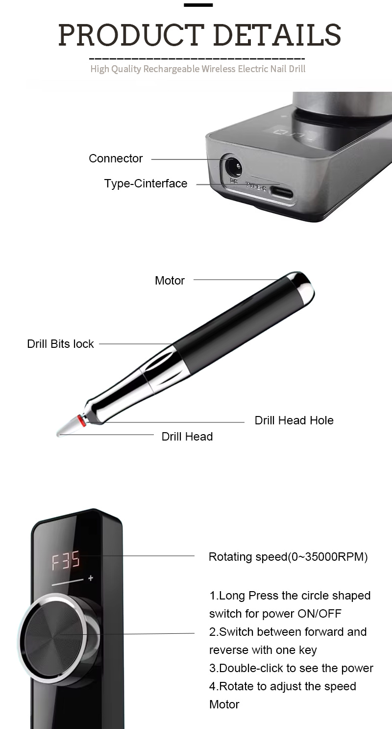 Преносна електрична бушилица за нокте са снажним мотором 65в 35000рпм