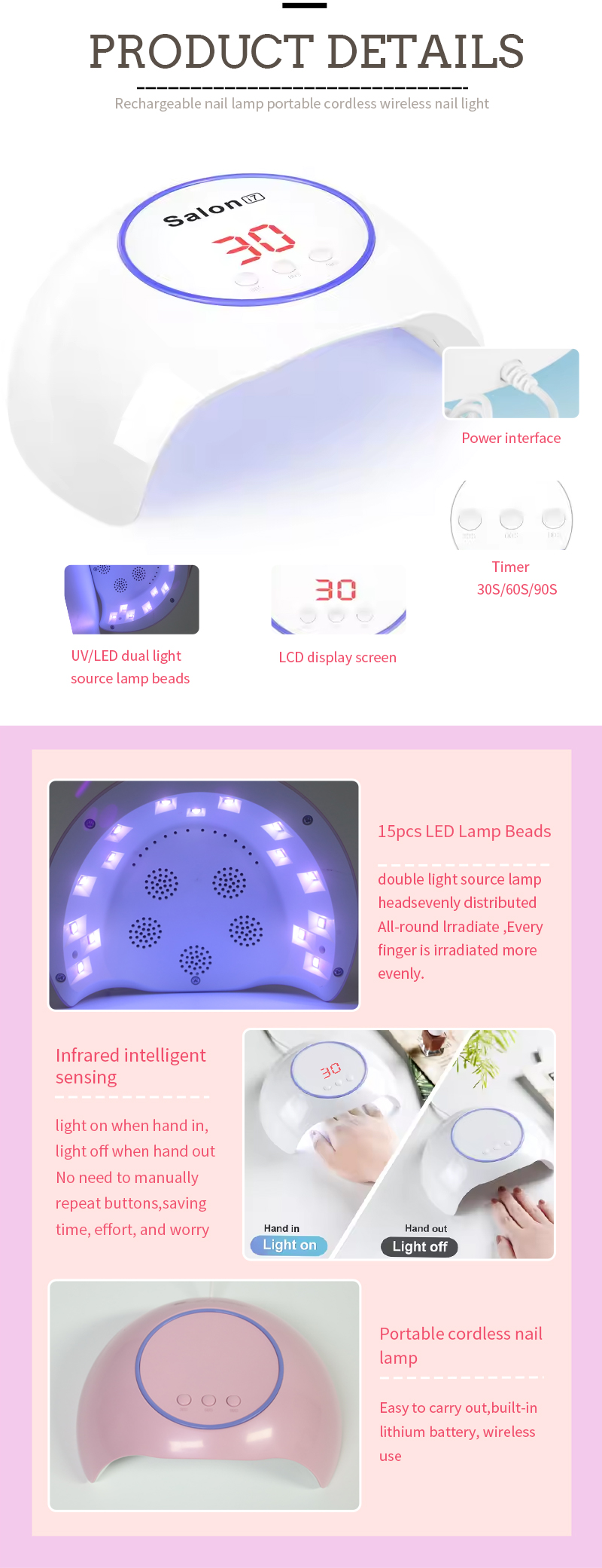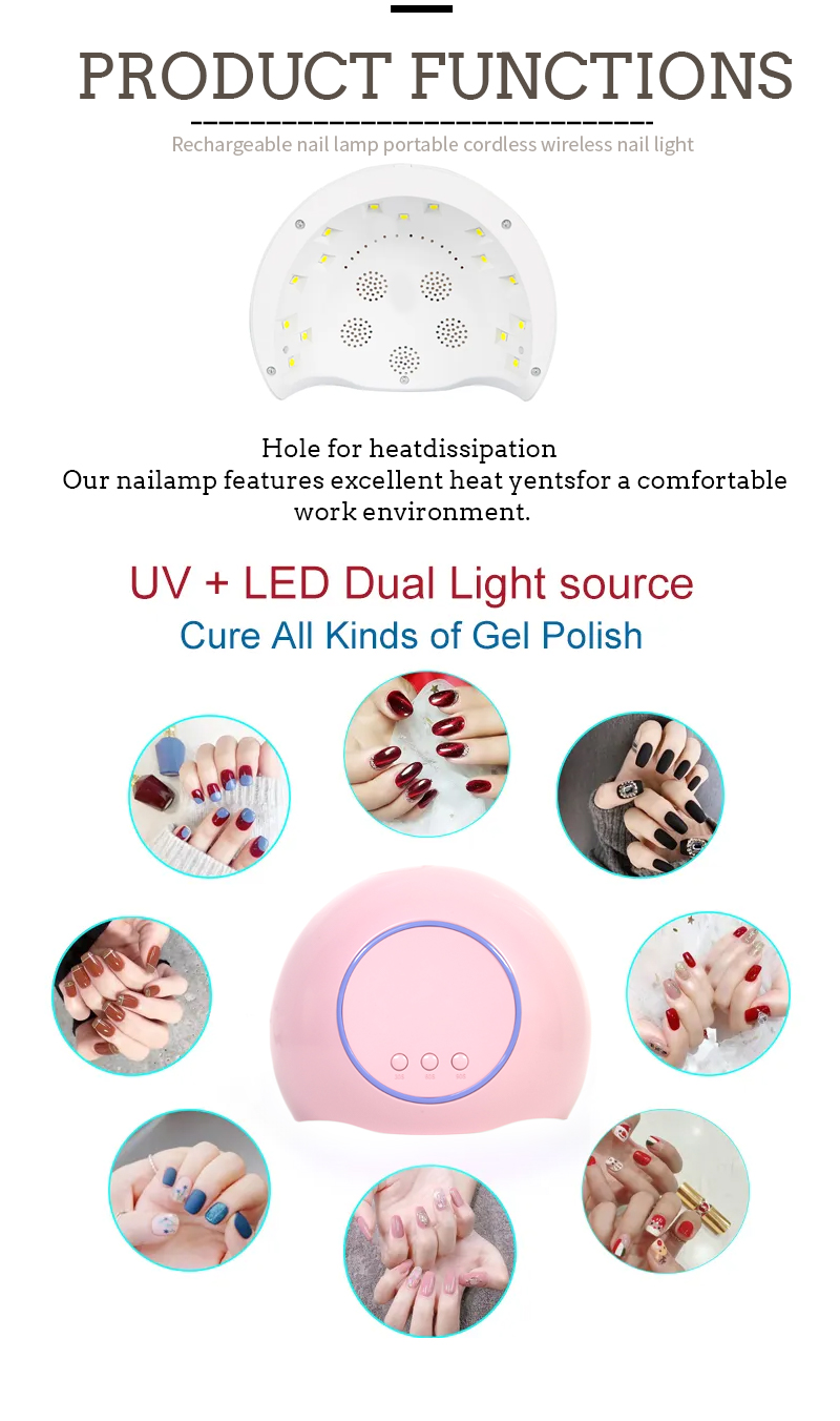 Производ осигурава да је исекну и засељивање без скупљања. Његови двоструки извори светлости пружају нежно гријање да би се спречило ручно уклањање боје и напрезања очију, погодан за обе руке и ноге, испоручујући изузетно брзе резултате сушења.