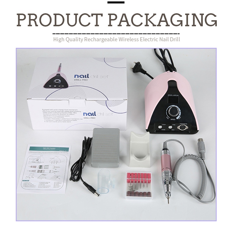 Садржај ове професионалне преносне машине за бушење ноктију од 35.000 обртаја у минути садржи производ за брушење, УСБ кабл за пуњење, упутство за употребу производа и лагану и преносиву кутију.