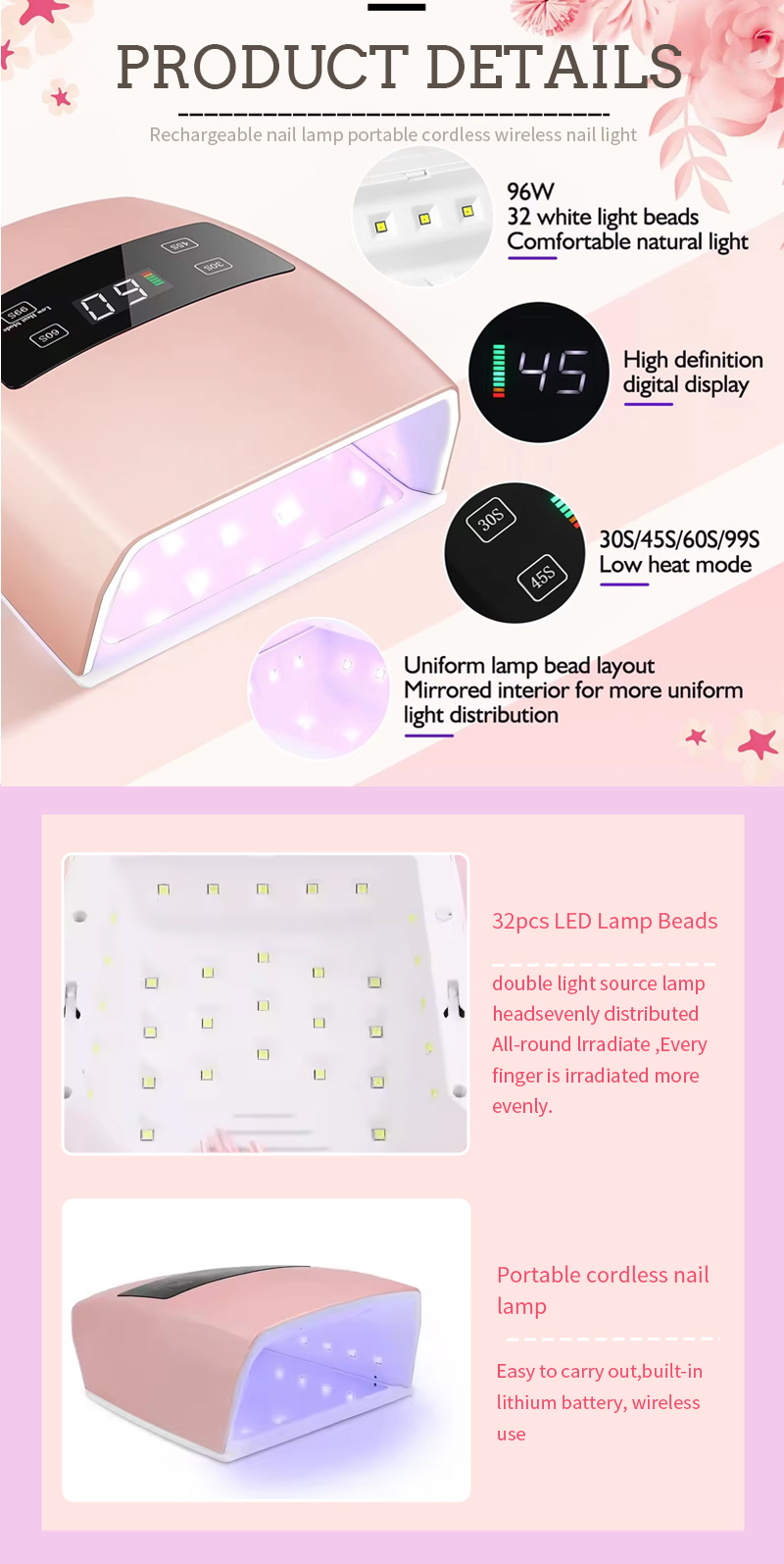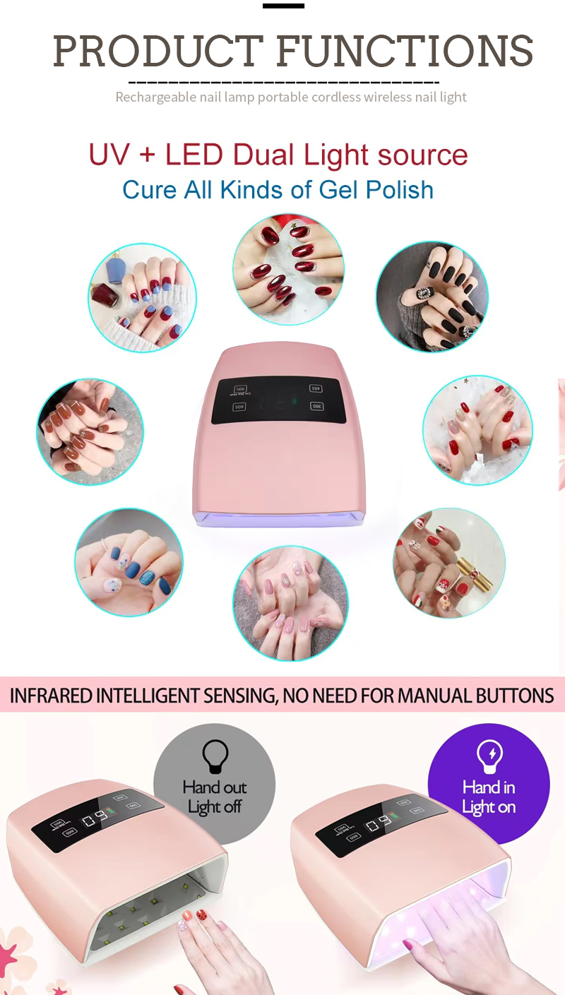 Производ обезбеђује равномерно сушење лепка без скупљања. Његови двоструки извори светлости обезбеђују нежно загревање како би спречили промену боје руку и напрезање очију, погодно за руке и стопала, дајући изузетно брзе резултате сушења.