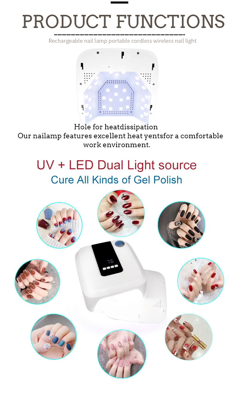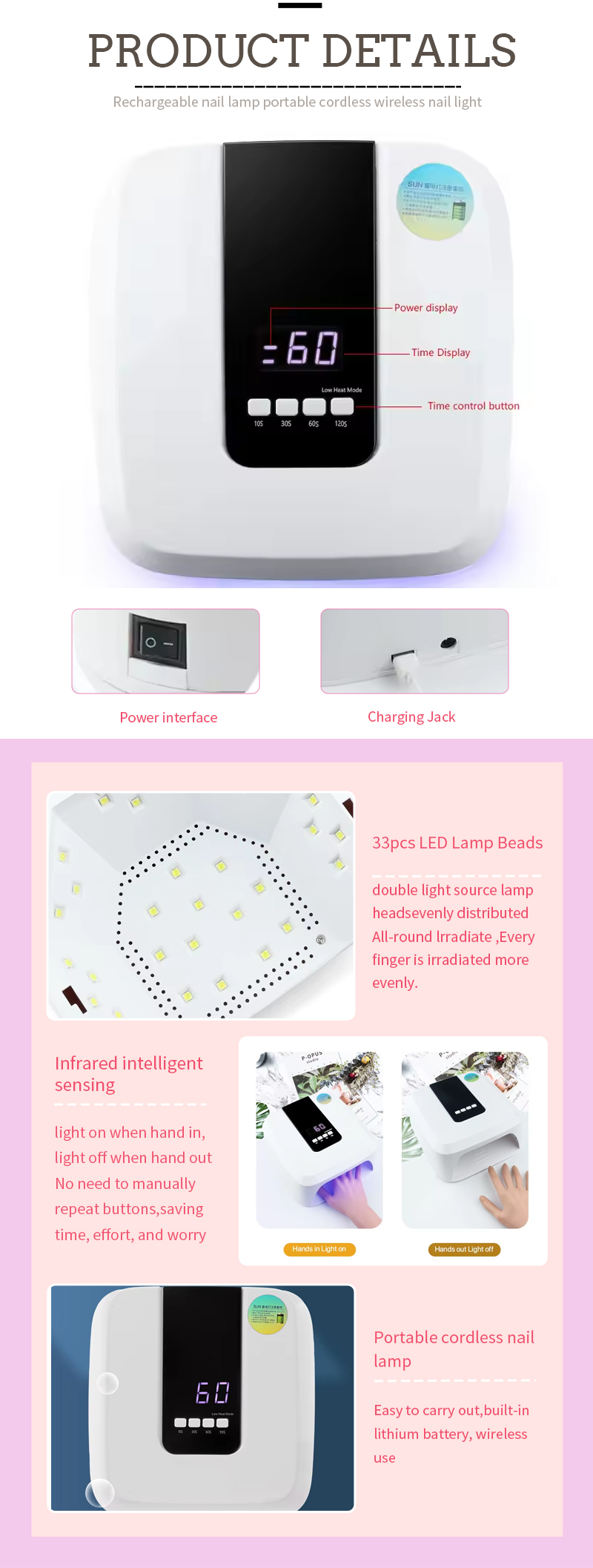 Производ обезбеђује равномерно сушење лепка без скупљања. Његови двоструки извори светлости обезбеђују нежно загревање како би спречили промену боје руку и напрезање очију, погодно за руке и стопала, дајући изузетно брзе резултате сушења.