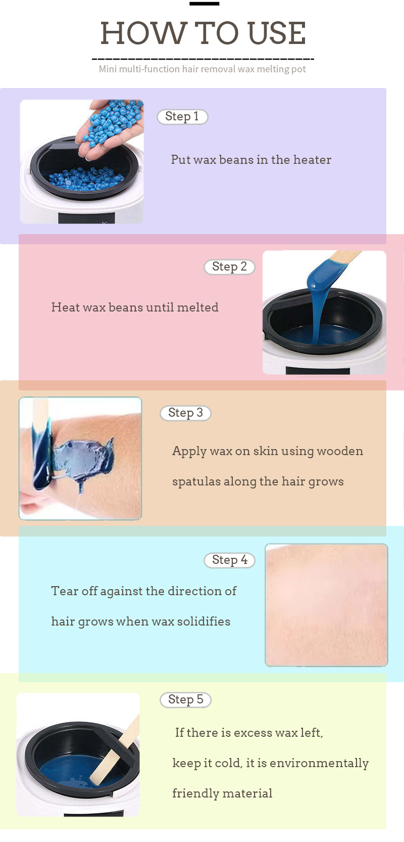 Метода рада са воском за депилацију производа, што је температура виша то се восак брже топи, што је нижа температура то се восак топи спорије, прво сипајте у одговарајућу количину зрна воска за депилацију, загрејте док се зрна воска не истопи, затим делови за депилацију равномерно обложеног воска за депилацију и на крају се одвојите од смера раста длачица.